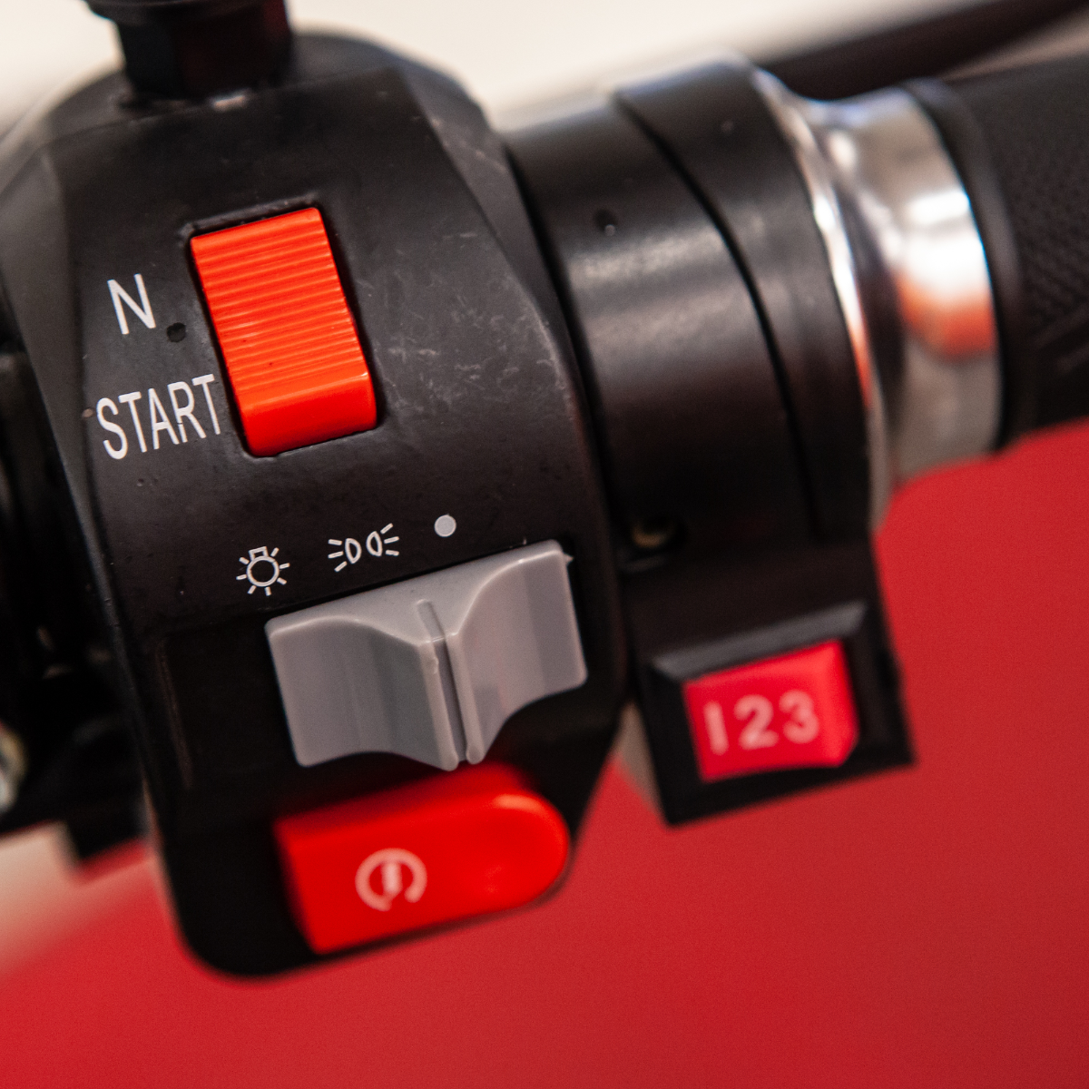 Ohjaustangon katkaisimet oikea, sisältää parkkien, ajovalojen, äänimerkin ja kaasun käyttökytkimen.Alkuperäisosa, sopii Kontio Motors e-Scooter 2.0
