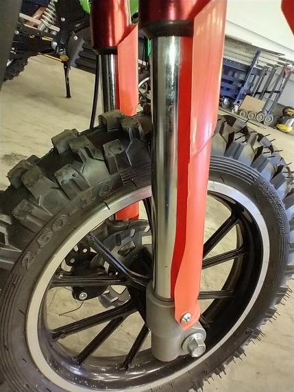 Etuhaarukka, sisältää ylä- ja alakiinnikkeet, ohjaustangon kiinnikkeet sekä molemmat etuiskunvaimentajat.Alkuperäisosa Kontio Motors Kids Cross