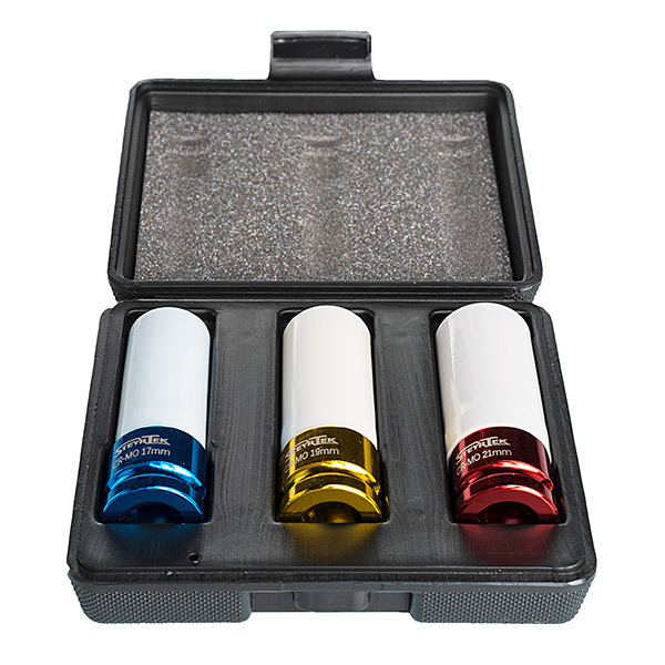 Laadukkaat SteyrTek-vannehylsyt alumiinivanteilleSteyrTek aluvannehylsyt ovat korkealaatuista kromimolybdeenia ja muovisuojuksen ansiosta vanteet eivät naarmuunnu. Pakkaus sisältää yhden hylsyn/koko. Koot 17 mm , 19 mm ja 21 mm, kaikki 1/2" karalla.