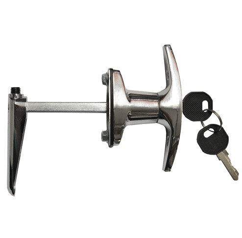 Metallinen kahva lukolla erinlaisiin käyttötarkoituksiin. Sis 2 avainta. Kromattu pinta.